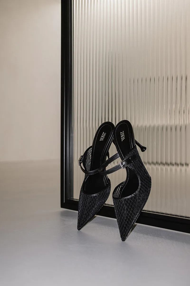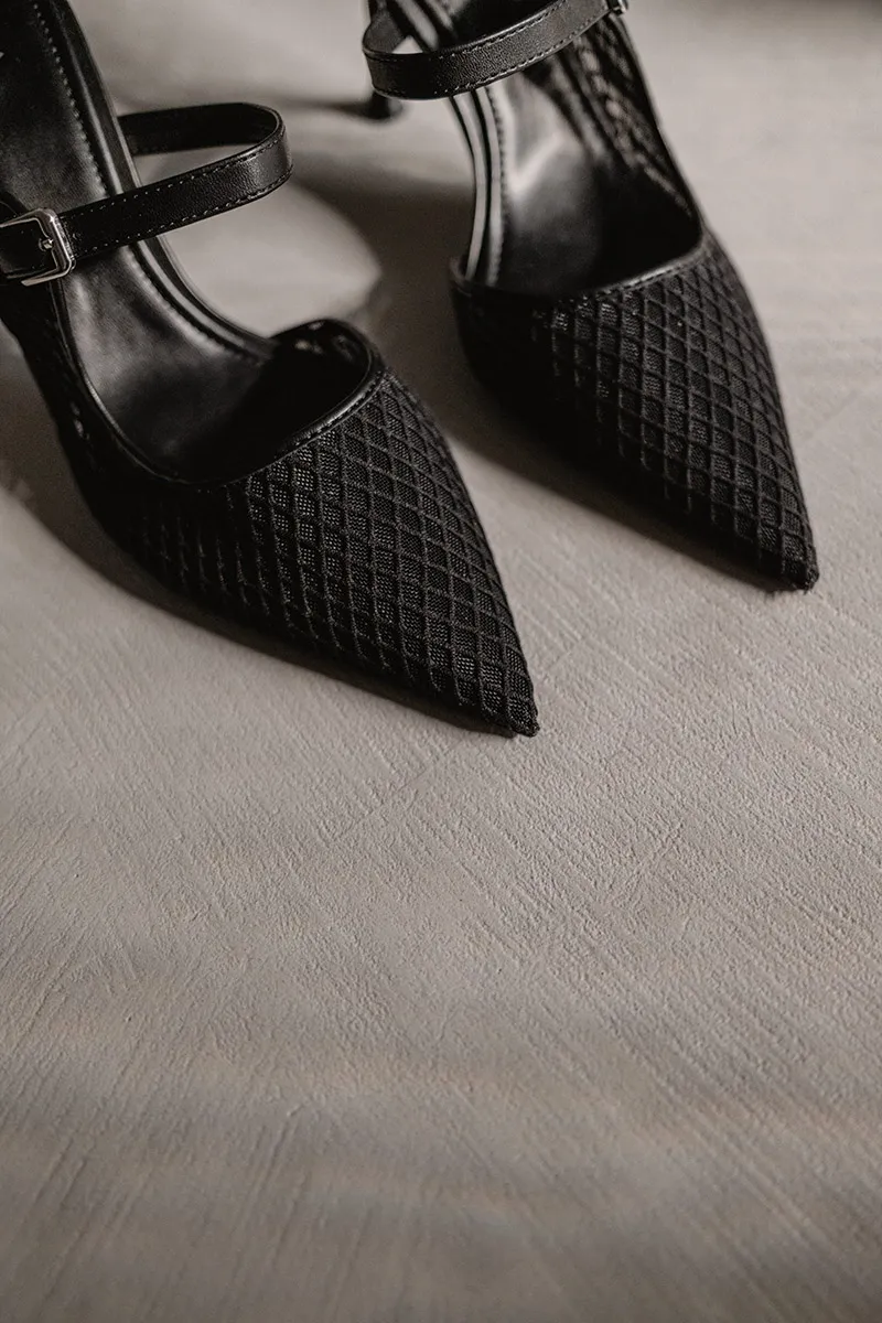 High-heel slingback shoes. Bow detail on the front. Back strap with elastic piece.